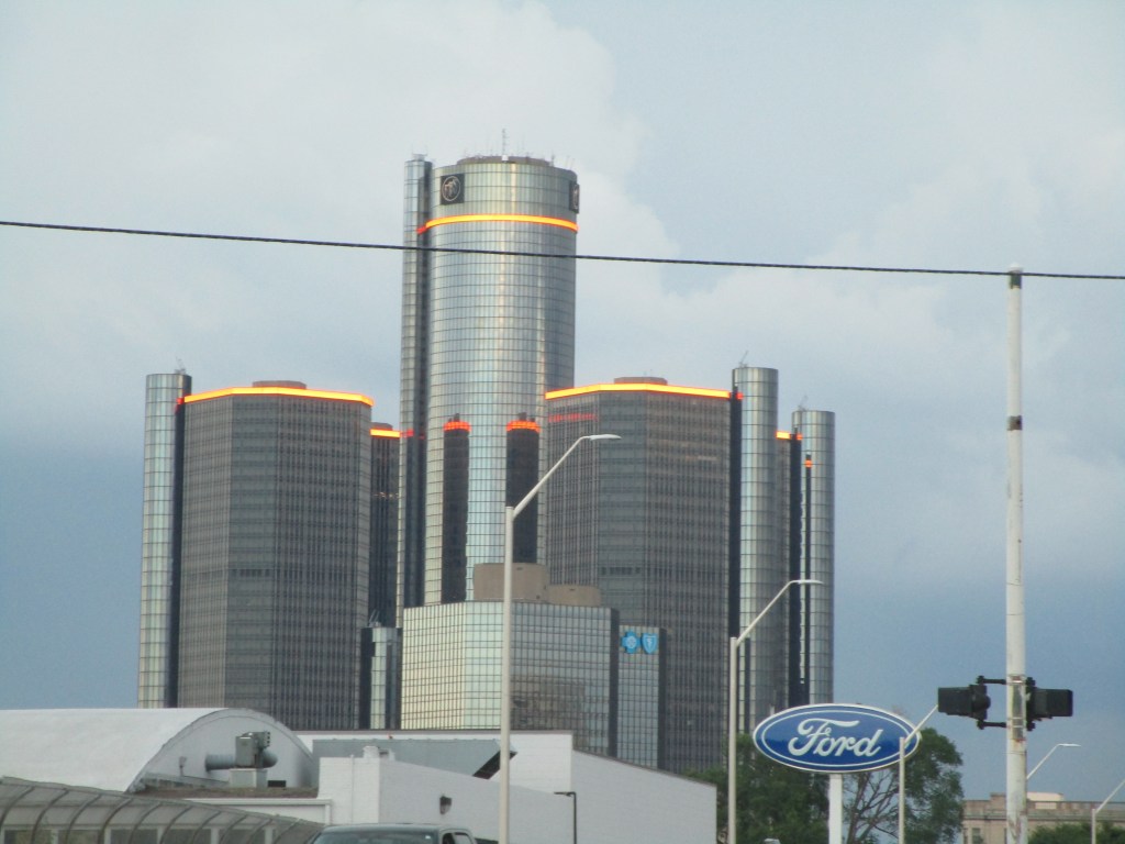 I had to put this picture in here. This huge building is the GM building, but what sign pops out at you? Ford. Too funny. You can see the Blue Cross Blue Shield logo too, but it’s tiny.